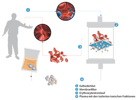 Die Membranplasmaphereseaustauschtherapie (von griech. ἀφαιρέιν wegnehmen) ist eine relativ einfache Methode ohne Nebenwirkungen für therapeutische Anwendungen oder zur Einstellung der Homöostase des Körpers. Das Verfahren besteht in der Separation der Blutzellen vom Plasma, das heißt vom flüssigen Blutanteil, der abgebaute Stoffwechselprodukte, chemische Stoffe, Umweltgifte wie z.B. Schwermetalle, und für die humorale Immunität und ihre Autoimmuninformation charakteristische immunologische Bestandteile enthält. Zusammengefasst: alle die Bestandteile (Schlacken) die im Falle der Erkrankung charakteristisch und aktiv sind. Das Patientenblut (1) wird über eine Membrane mit Nanolöchern (2) geleitet, die das Plasma von den Blutelementen separiert. Diese Separation ermöglicht es, Plasma zu sammeln, das zusammen mit den Toxinen und den pathologischen Immunfraktionen aus dem Körper herausgeführt wird und durch ein identisches Volumen von verschiedenartigen Lösungen auf der Basis physiologischer Kochsalzlösung ersetzt wird, während die zellulären Elemente (3) in den Kreislauf zurückgeführt werden.